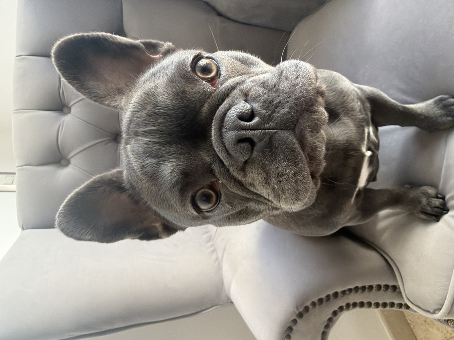 A gray French Bulldog lies on a tufted, gray armchair. The dog's head is tilted towards the camera, capturing its large, brown eyes and wrinkled face. Its ears stand erect. Part of the dog's front legs are visible resting on the chair. The armchair's armrest features studded detailing. Sunlight illuminates the scene.