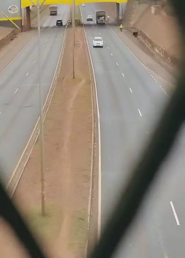 highway with several lanes of traffic, viewed through a chain-link fence. Cars and trucks drive on the highway under a series of yellow-roofed pedestrian overpasses. The camera zooms in on a white car traveling in the center lane. The car passes the camera. The highway appears slightly wet, possibly from rain. Buildings and trees are visible in the background.