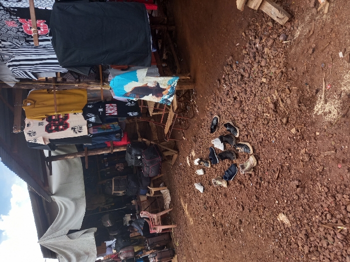 scene outside a shop in Soweto, Tanzania. The shop is made of corrugated metal and has a makeshift awning made of white canvas. Several pairs of shoes are scattered on the dirt ground outside the shop. There are also several bags, possibly luggage, leaning against the wall. The shop appears to be selling clothing, with a variety of shirts hanging on a clothesline.