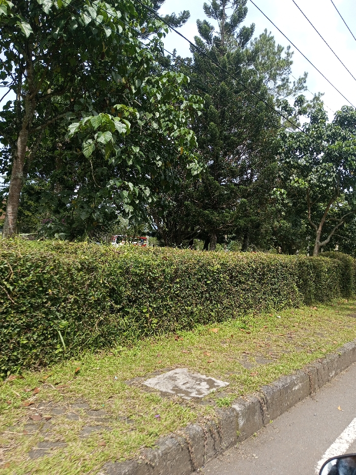 The image displays an outdoor scene in Namthoung, Laos, captured during daylight. In the foreground, a dark asphalt road with a narrow white line is visible on the lower right, bordered by a concrete curb separating it from a grassy verge. A roughly square, light-colored concrete slab is embedded in the grass of the verge, positioned left of the image center. A dense, uniformly trimmed green hedge extends horizontally across the mid-ground. Above and behind the hedge, a variety of mature trees form a thick natural barrier. These include a broadleaf tree with light bark and large green leaves on the left, and a tall, dark green coniferous tree centrally located. Partially obscured by the foliage behind the hedge, a white vehicle with red accents is visible. The upper portion of the image shows a bright, light blue sky, traversed by several dark electrical wires running diagonally from the top right. No individuals are visible.