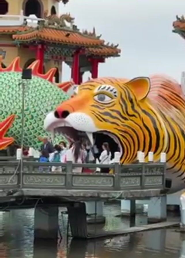 pond with a bridge leading to a pagoda, adorned with large sculptures of a dragon and a tiger. People are seen walking on the bridge, entering the tiger's mouth. The dragon is green with red fins and a white head with blue accents. The tiger is orange with black stripes. The pagoda is cream colored with red and green accents. The sky is overcast.