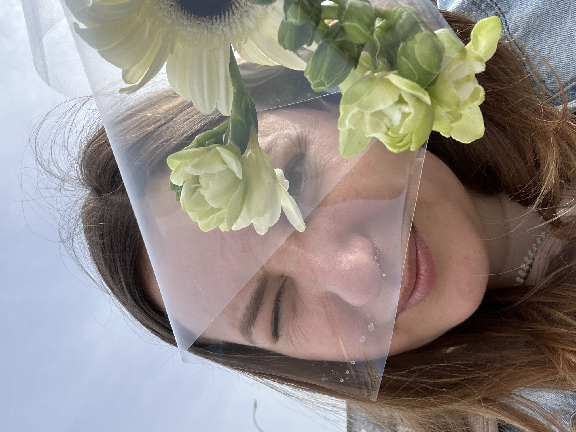 A close-up image depicts a young adult female's face partially obscured by a transparent, crinkled plastic sheet, consistent with flower bouquet wrapping, positioned diagonally across her facial features. The woman has brown hair, visible along the top and left side of the frame, and wears a light-colored top under a blue denim jacket. Her right eye is closed, and her mouth is closed with a slight upward curve, suggesting a subtle smile or wink. Beads of moisture or small imperfections are visible on the plastic near her nose and cheek. Directly behind and partially in front of the plastic are several flowers: a large, pale yellow daisy-like bloom with a dark center is visible on the upper right, and multiple smaller, light green/chartreuse flowers, some appearing as buds, are distributed across the right and lower sections of the image. The background consists of a bright, light blue sky with minimal cloud cover, and a faint, light-colored pole or structure is discernible in the upper left quadrant. The scene takes place in the city of Kharkiv, Ukraine.