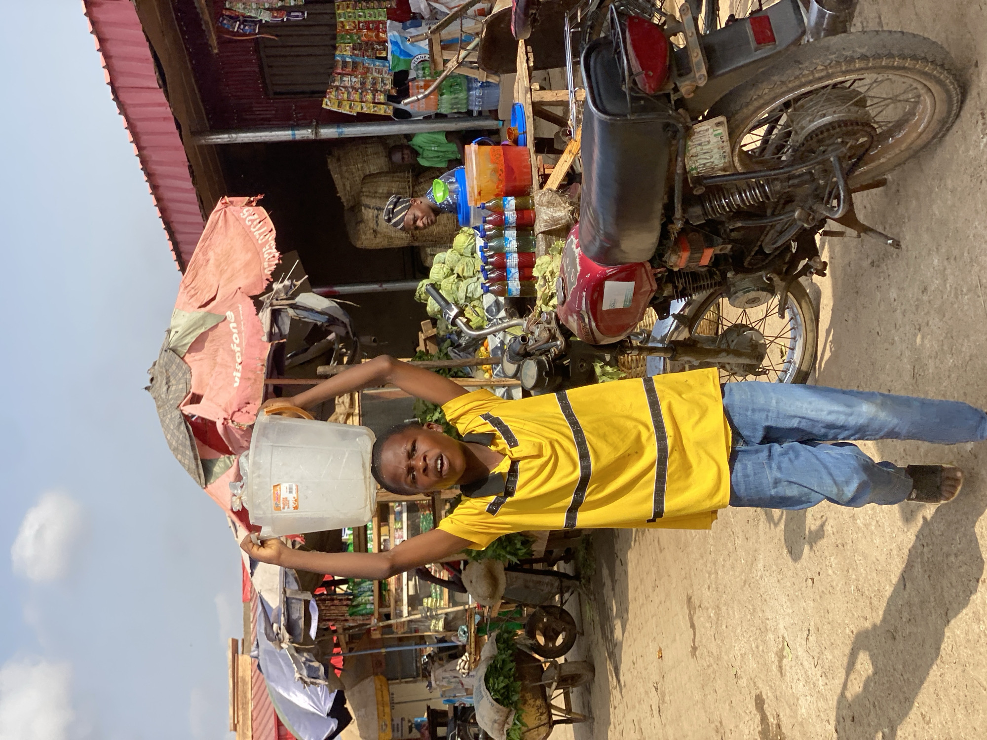 A young person in a yellow and black shirt and blue jeans stands outdoors, carrying a large, empty, clear plastic container above their head, apparently for hauling water. The background shows a busy, informal market area likely in Kafanchan, Nigeria. A motorcycle is parked nearby, laden with goods. Foodstuffs, containers of liquids, and green produce are visible for sale. Other individuals are indistinctly present in the background. The surrounding area appears to be an unpaved street with nearby buildings and makeshift stalls.
