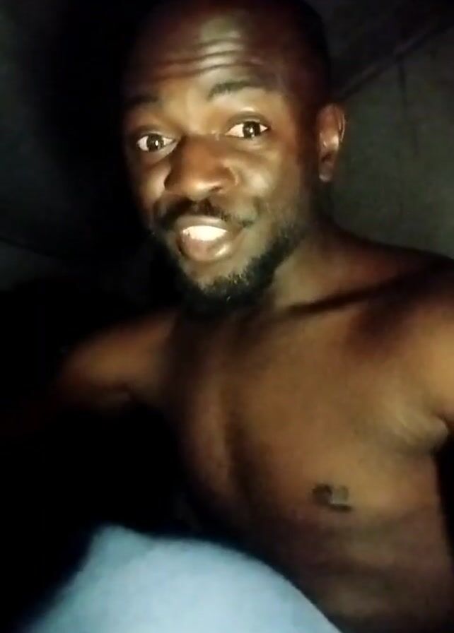 A close-up shot features a shirtless Black man with a trimmed beard. He is smiling and looking directly at the camera, while resting under a light blue blanket. The background is dark.