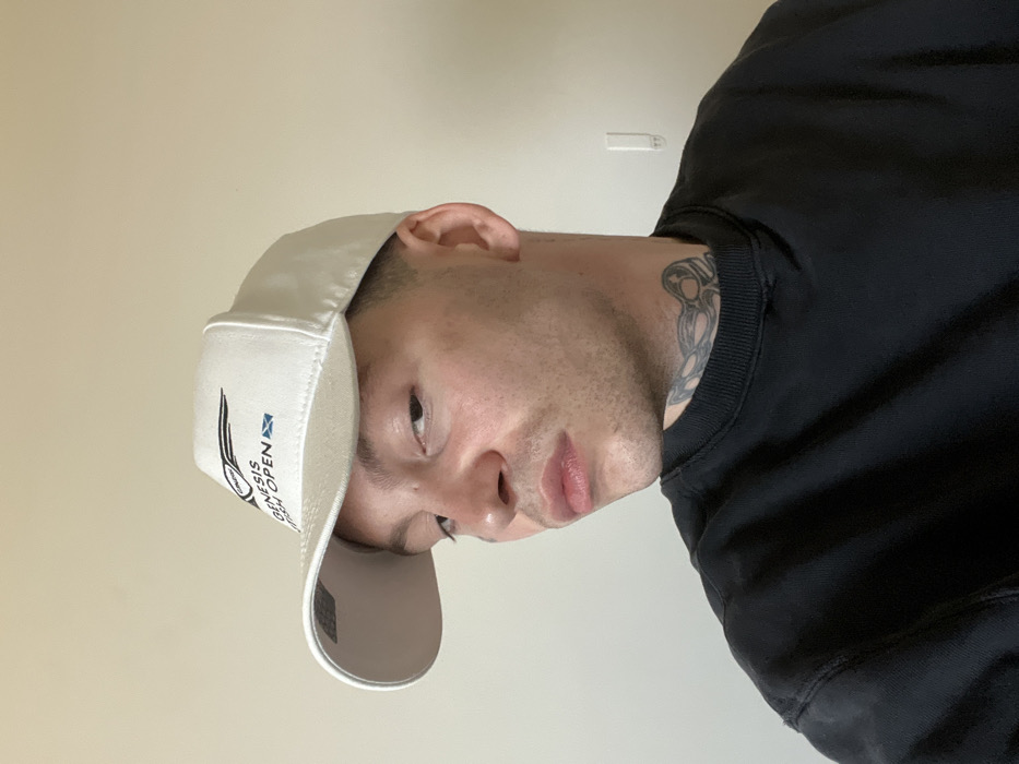 A portrait, captured indoors in Orsay, France, depicts a single individual, identified as an adult male, from the chest up. The subject faces the camera directly with a slightly tilted head and an even gaze. He wears a white baseball cap with a lighter-colored brim; the cap features a black logo and text reading "GENESIS SCOTTISH OPEN" alongside a small blue and white Scottish flag emblem. A complex black-ink tattoo is visible on the left side of the subject's neck. He is dressed in a plain black crewneck sweatshirt. The background is a solid, light-colored wall. A small, white, rectangular electronic device with two protrusions is mounted on the wall to the right of the subject.