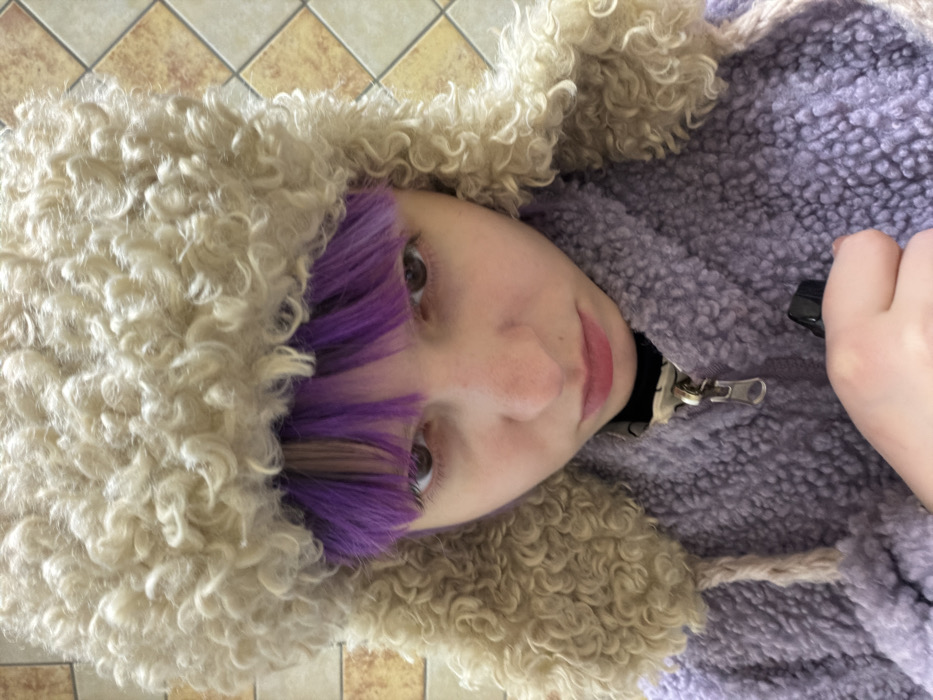 A close-up portrait photograph depicts an individual indoors in Butsenino, Russia. The subject, with fair skin and dark brown eyes, faces the camera directly, displaying a neutral to slightly stern expression. Purple bangs are visible across their forehead, extending from beneath a cream-colored, curly faux-fur ushanka-style hat with braided ties. The individual is wearing a lavender-colored, textured zippered jacket, likely fleece, with a metallic zipper pull visible at the center. Their right hand is positioned at chest level, gripping a small, dark-colored object, consistent with an electronic vaporizing device. The background consists of a tiled wall featuring a grid pattern of alternating light brown and cream-colored square tiles.