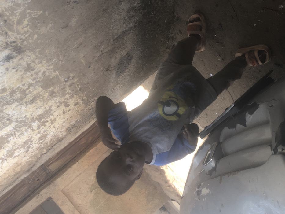 An image captured in Kufena, Nigeria, depicts a young child standing in an outdoor, semi-enclosed space
