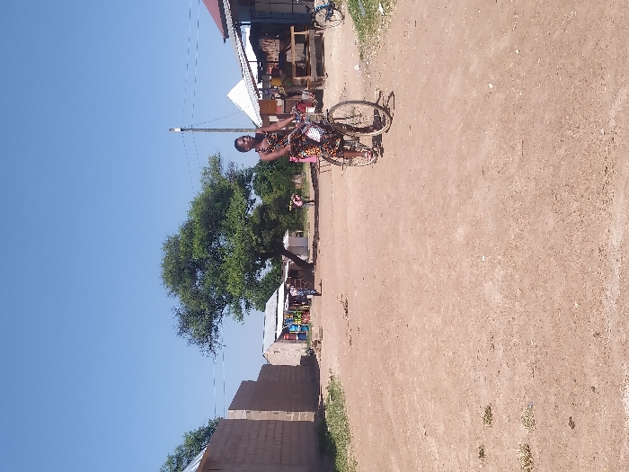 An outdoor scene in Lugeye, Tanzania, depicts a unpaved dirt road under a clear blue sky on a sunny day