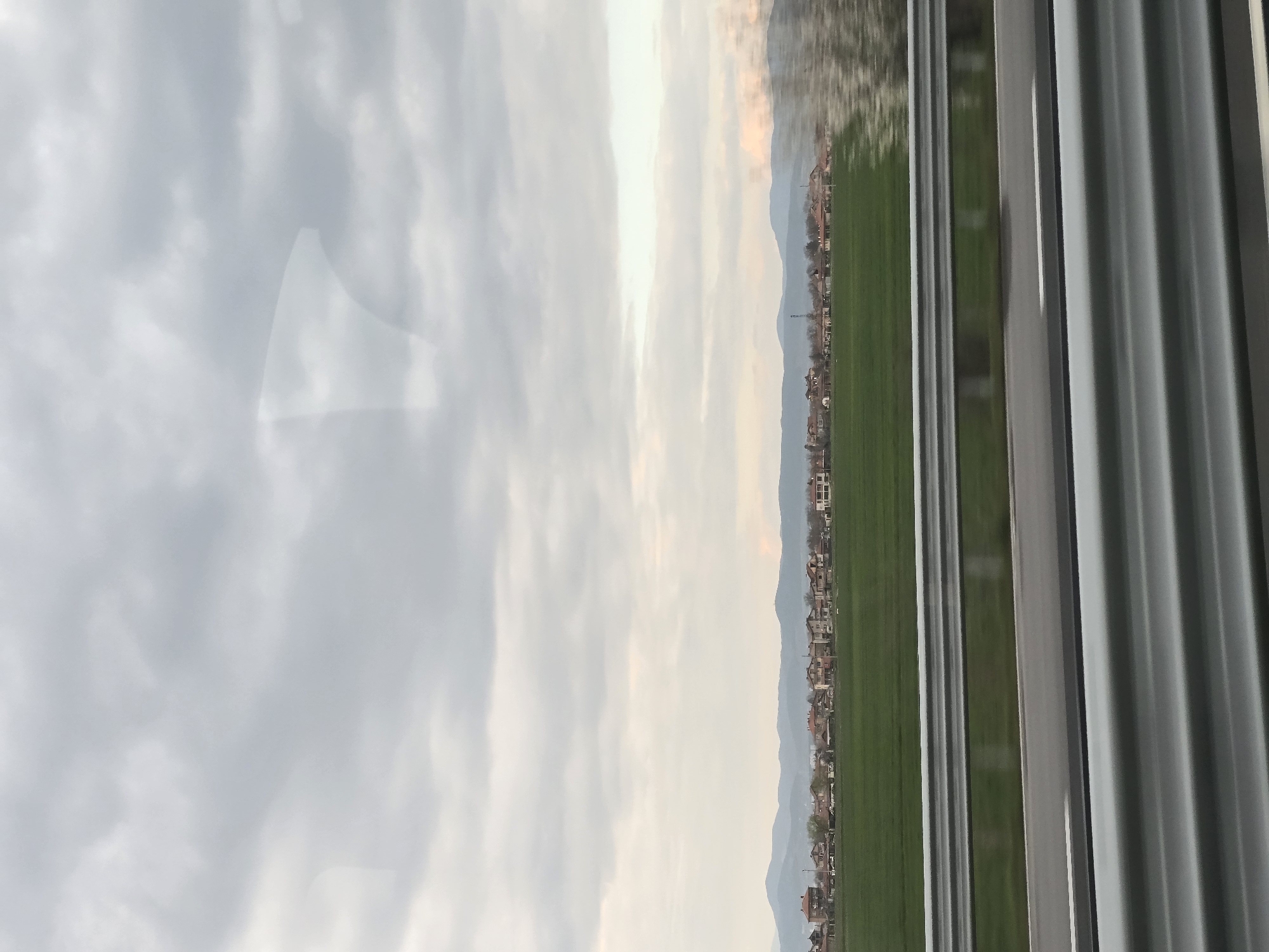 The image depicts a rural landscape near Zagore, Bulgaria, captured from a moving vehicle on an overcast day. The foreground features a multi-tiered, corrugated metal guardrail running horizontally, indicative of a highway, with visible motion blur. Beyond the guardrail, a paved road surface with a faint white lane line is present, also showing blur. A wide expanse of vibrant green field, likely agricultural crops, stretches across the midground. In the upper midground, a horizontal cluster of residential buildings constitutes the village of Zagore. These structures are predominantly single or two-story, characterized by reddish-brown tiled roofs, and are interspersed with sparse leafless trees or bushes. One particularly blurred, light-colored object, possibly a blooming tree or bush, is visible on the far right side of the midground. The background reveals a range of low, undulating mountains or hills extending across the horizon, appearing somewhat hazy. The sky overhead is heavily overcast, dominated by various shades of grey and white clouds. Faint, irregular reflections are discernible on the upper left portion of the image, suggesting the photograph was taken through a window. No individuals or specific actions are visible within the frame.