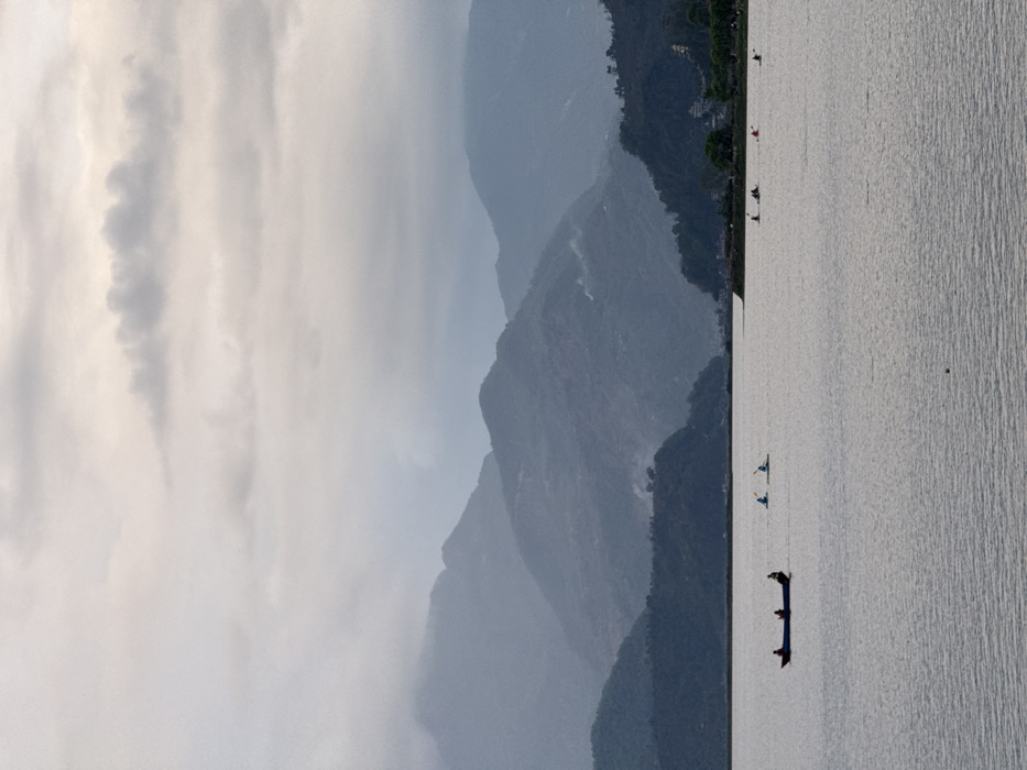 The image depicts an expansive view across Phewa Lake in Pokhara, Nepal, under an overcast sky. The upper third of the frame is filled with a dense, light-grey cloud cover, indicating diffuse light. Below the clouds, a series of mountains rise, exhibiting atmospheric perspective with closer peaks appearing darker and more detailed, transitioning to lighter, bluer tones in the distance. The closest mountains bordering the lake feature visible tree cover, and a faint plume of smoke or mist is observed rising from a mid-range slope. The lower two-thirds of the image are dominated by the calm, grey-blue surface of Phewa Lake, displaying subtle ripples. Several watercraft are distributed across the lake. In the left-midground, a dark, elongated traditional wooden boat carries three individuals, positioned as silhouettes against the water. Further to the right of this boat, two lighter-colored kayaks, each with a single occupant, are observed paddling. Along the right side of the lake, closer to a vegetated shoreline, approximately five additional individuals in individual kayaks or small boats are dispersed, engaging in water activities. The shoreline on the right features dark green foliage and hints of structures.