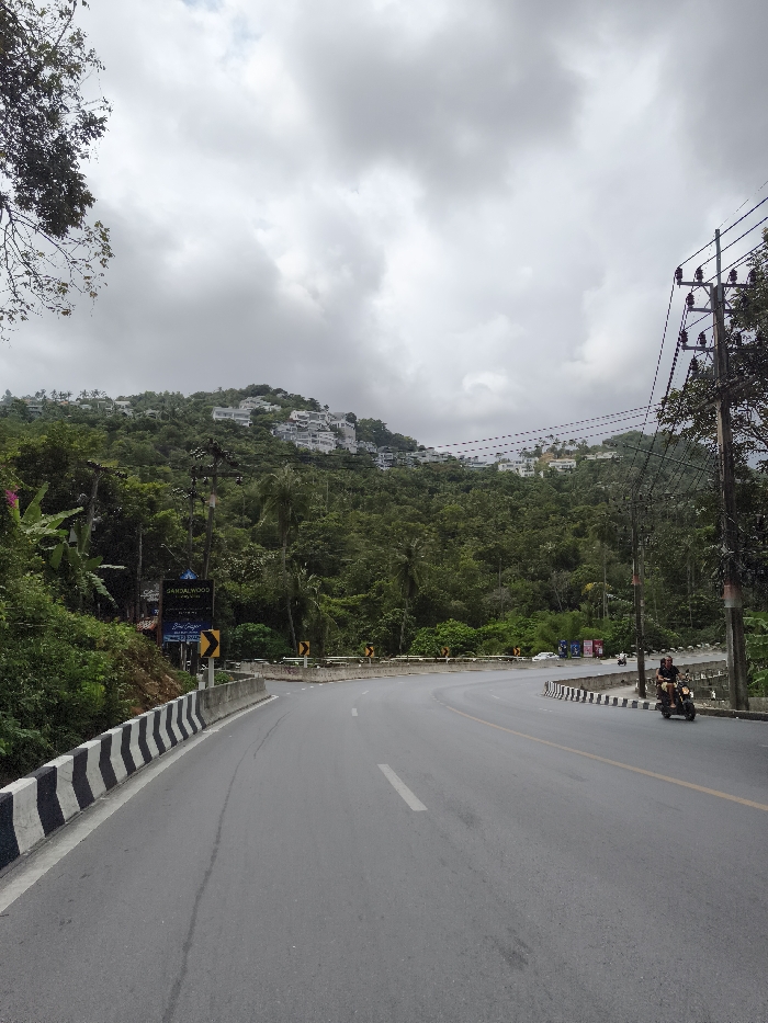 A curving road winds through a lush, green landscape under an overcast sky. The road is paved and marked with a center line. A motorcycle drives to the right of the road. A black and white barrier lines one side of the road. A forested hillside dotted with white buildings rises in the background, alongside power lines. Signage and trees are along the roadside.