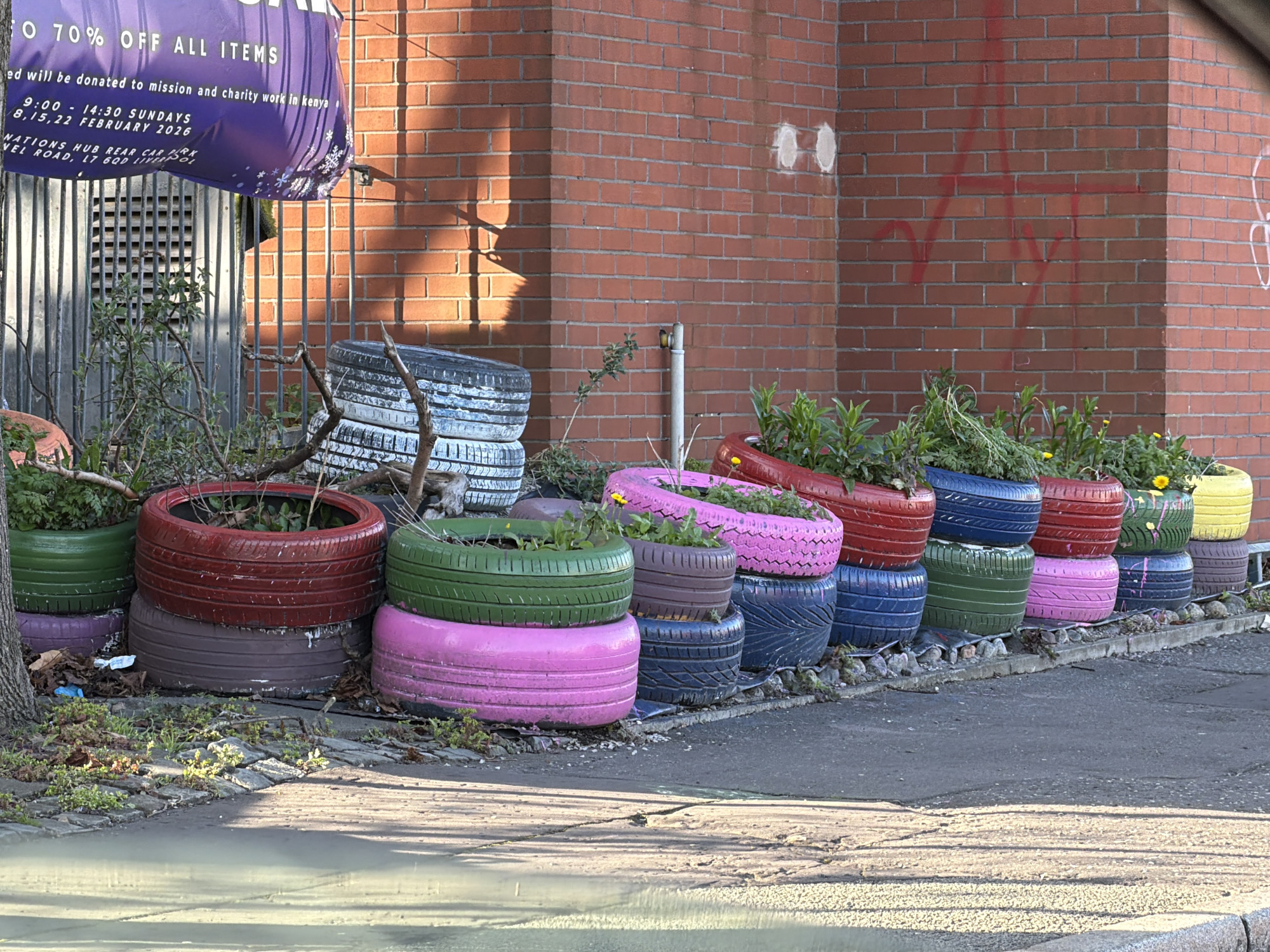row of painted tires used as planters, stacked along a sidewalk next to a brick building. The tires are painted in various colors including green, red, pink, blue, and yellow. Some of the planters contain greenery. The brick building has graffiti on it. A sign is visible in the background, partially obscured by a metal fence, advertising 70% off all items, and that proceeds will be donated to mission and charity work in Kenya. The sign mentions "Nations Hub Rear Car Park, Vel Road, L7 6QD", placing the location in Liverpool, United Kingdom. The date "8,15,22 FEBRUARY 2026" is also visible on the sign. The sidewalk is concrete and has debris scattered along the edge. Sunlight casts shadows on the building and sidewalk.