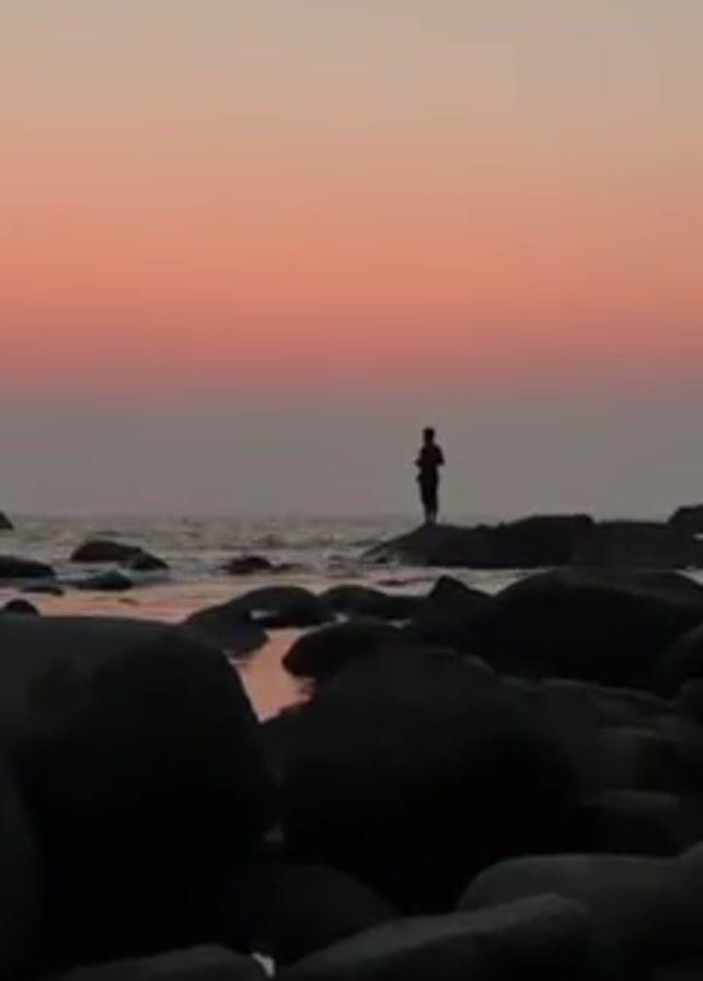 silhouette of a person fishing on a rocky outcrop at sunset. The sky is colored with hues of orange and pink. Dark rocks are scattered in the foreground leading towards the ocean, where the person stands with a fishing rod. Small waves can be seen in the background.