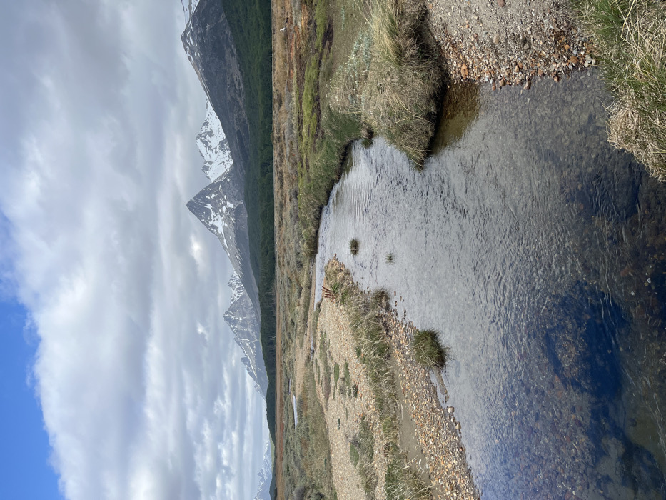 The image displays a wide natural landscape located within the city of Unknown, Argentina. In the foreground, a clear, shallow stream flows from the middle-ground towards the viewer, its bed composed of visible pebbles and small rocks. The stream banks are irregular, featuring gravel, soil, and patches of dry and green grass. No individuals or man-made objects are present in the immediate foreground. The midground consists of a sprawling, flat plain covered with diverse vegetation including reddish-brown mosses, light green grasses, and pale yellowish-brown low-lying shrubs. A small, white avian subject is identifiable on the right side of this plain, positioned near the distant tree line. The background features a dense, dark green forest stretching horizontally across the scene. Beyond this forest, a range of rugged, snow-capped mountains dominates the horizon. Several peaks are visible, with the most prominent being a sharply triangular, snow-covered mountain near the center. The upper slopes of the mountains are extensively covered in snow. The sky above is partly cloudy, displaying a mixture of extensive gray cloud cover and limited areas of clear blue sky, particularly in the upper left quadrant. The overall environment is a pristine, uninhabited natural setting.