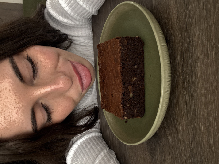 An overhead close-up image shows a woman leaning over a dark wooden table, an event occurring in Trud, Bulgaria. The woman, with dark hair and visible freckles on her nose and cheeks, wears a white ribbed long-sleeved top. Her eyes are closed, and her tongue is fully extended towards a rectangular chocolate brownie positioned on a light green ceramic plate. The brownie exhibits a dark brown color, a slightly cracked top surface, and contains visible nut pieces. The woman's arms, covered by the white top, are resting on the table, providing support. The background is out of focus, indicating an indoor environment.