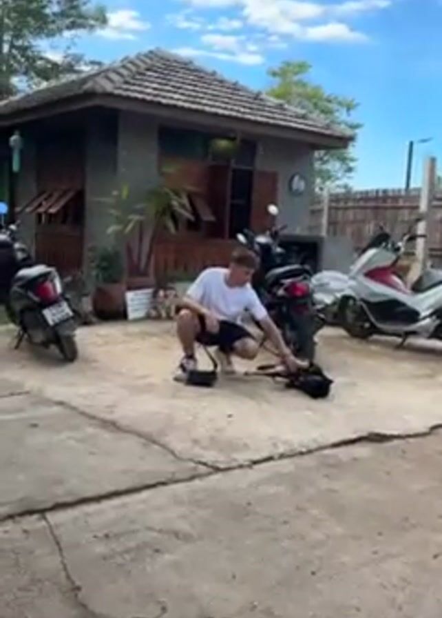 young man with light skin and short blond hair crouching down and petting a black dog on a concrete surface. The man is wearing a white t-shirt, black shorts, black sneakers, and black socks. He is also wearing a black cross-body bag. Behind him, there are three parked scooters. To the left is a gray building with a brown tiled roof. There are plants, small figurines, and colorful decorations in front of the building. The sky is blue with scattered white clouds.