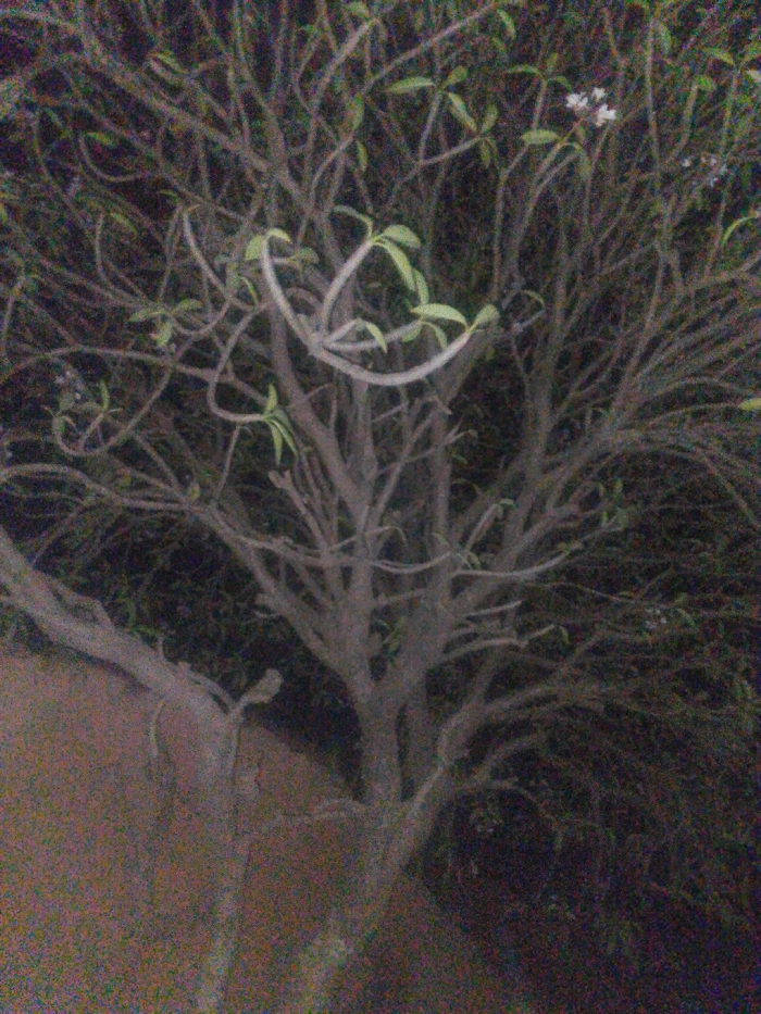 A dimly lit tree stands prominently in the frame. Its bare branches reach upwards, displaying sparse green leaves and a few small white flowers. The trunk is weathered and gray, blending somewhat with the dark background. The ground near the tree appears to be a reddish-brown color. The overall image quality is grainy, possibly due to low lighting conditions.