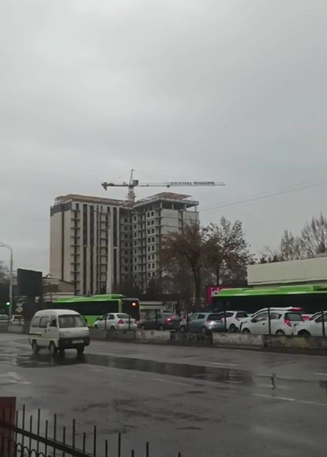 street scene on a cloudy, rainy day. A tall building under construction is visible in the background, with a crane atop. There are several buses, green in color, and other vehicles moving along the wet road. On the sidewalk, two pedestrians are walking. A black metal fence runs along the edge of the sidewalk next to the street. A sign for "Idea" is prominent near the sidewalk. Bare trees are scattered throughout the scene. The overall atmosphere is gray and damp.