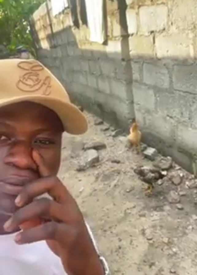 A man wearing a tan baseball cap and a white t-shirt holds a camera up to his face, recording a video. He gestures towards a chicken in the background with his right index finger. The chicken is standing near a concrete block wall. Some clothes are hanging on a line above the wall. The ground is dirt and there are some rocks scattered around.
