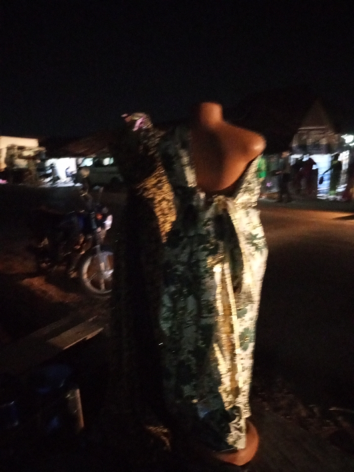 A dress on a mannequin stands outdoors at night, partially lit by streetlights. The fabric is light-colored with a green and gold floral pattern, draped over the mannequin's form. In the background, blurred lights indicate buildings and people gathered. A motorcycle is parked to the left. The scene appears to be a street or market area at night.