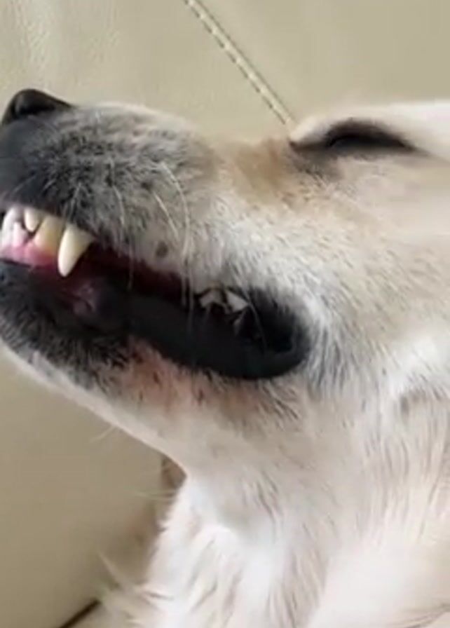 A close-up shot shows the side of a dog's face. The dog is lying on a light-colored leather couch. The dog has white fur and dark nose. Its mouth is open slightly, revealing its teeth. Someone speaks, praising the dog.