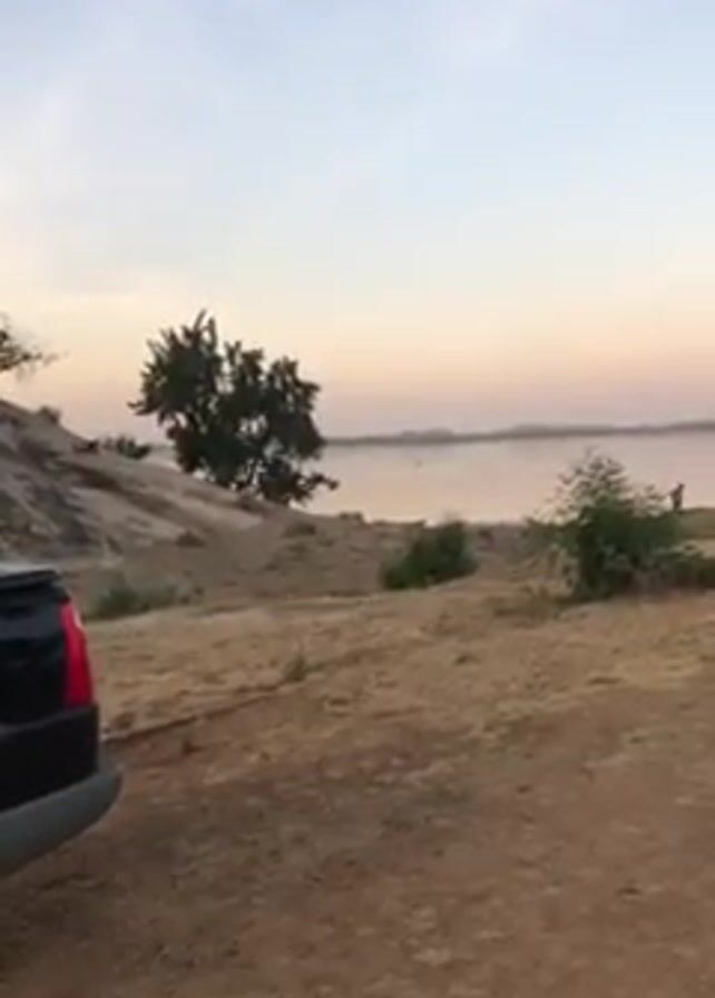 The video depicts a tranquil lakeside view at dusk. A dark-colored vehicle is parked in the foreground on a sandy, dirt-covered area with sparse vegetation. The focus shifts to a calm lake extending into the distance, where a small boat with two people is visible. In the background, there are distant hills or landmasses. The sky displays a gradient of soft colors, indicative of a sunset or sunrise.