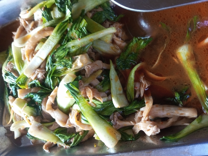 This image shows a close-up of a prepared food dish. A mix of bok choy, a leafy green vegetable, and what appears to be sliced mushrooms are stir-fried together. A savory, brown-colored sauce coats the ingredients, enhancing their visual appeal. In the upper-right corner, a separate section of the dish contains a lighter, broth-like liquid, suggesting the presence of a soup or stew component. The metal serving tray or container is also visible, framing the food.