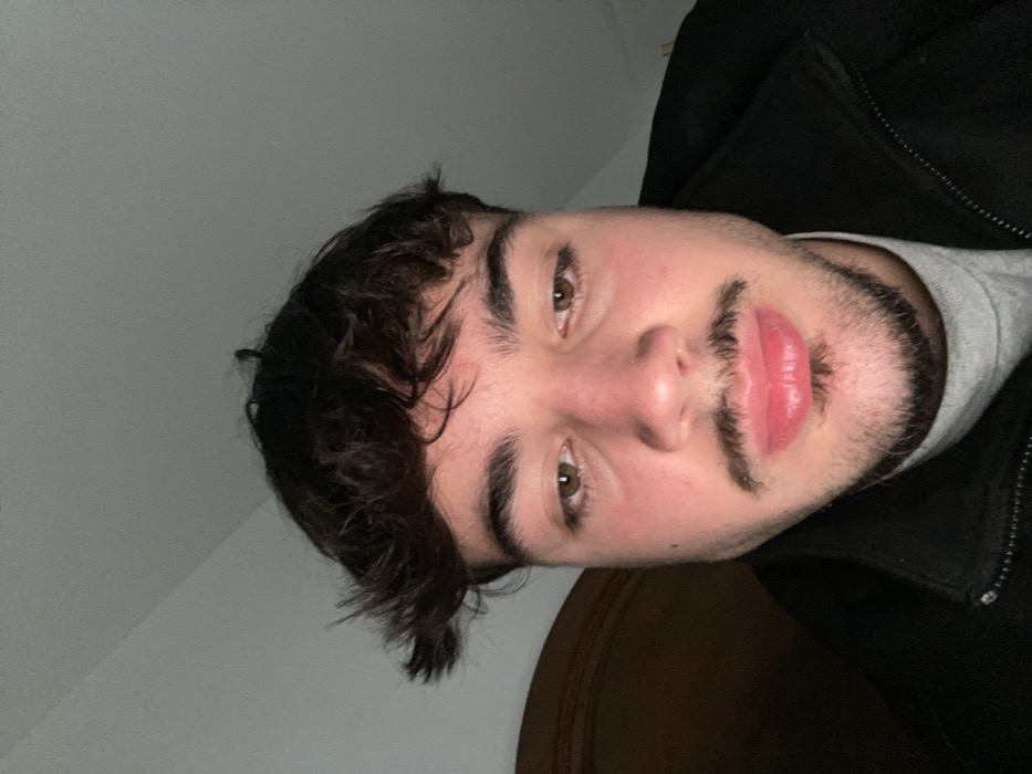A close-up, head-and-shoulders portrait depicts a young adult male with dark, wavy hair styled in a fringe and a short, messy cut