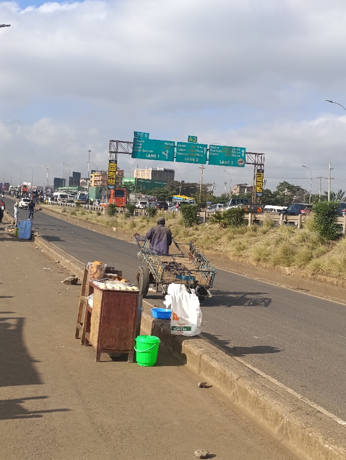 A street view shows a man pulling a cart on a highway shoulder next to a makeshift food stand. The stand has a wooden cabinet, topped with items wrapped in plastic, a blue bucket, and a large white sack. Overhead highway signs indicate directions, including "Exit 9" to Thika and Barnicke in Lane 1, and A2 towards Nairobi, Eldoret, and Kakamega in Lanes 2 and 3. Heavy traffic fills the highway, with numerous cars, trucks, and buses. A grassy area separates the highway lanes.