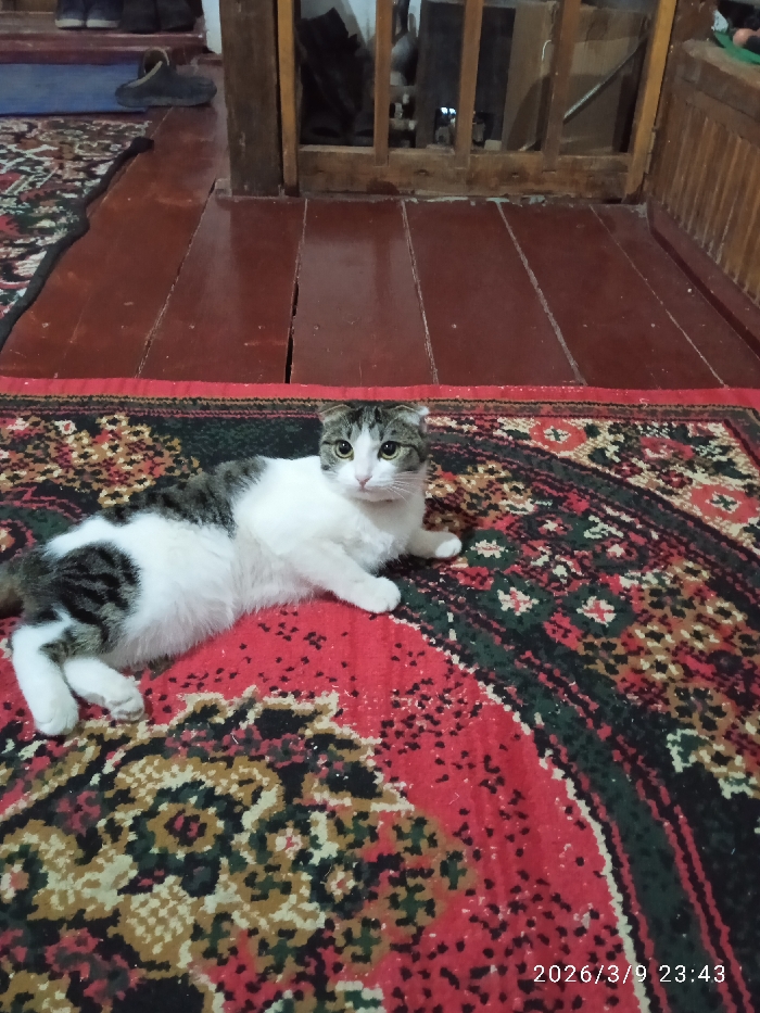 A domestic cat with white fur and prominent dark grey/black tabby markings on its back, tail, and head is centrally positioned, lying on its belly. The cat, exhibiting slightly folded ears and green-yellow eyes, faces directly forward with its front paws tucked beneath its body and hind legs extended. It rests on a large, ornate rug predominantly red, featuring intricate black, dark green, and tan geometric and floral patterns. Beyond the rug, a floor constructed of dark reddish-brown wooden planks is visible, showing distinct seams and signs of wear. In the upper background, a wooden structure composed of vertical slats partially obstructs a dimly lit area where various items, including a dark shoe and a slipper, are discernible. No human presence is observed. The scene is indoors, located in the city of Khujayli, Uzbekistan, and the image was captured on March 9, 2026, at 23:43.