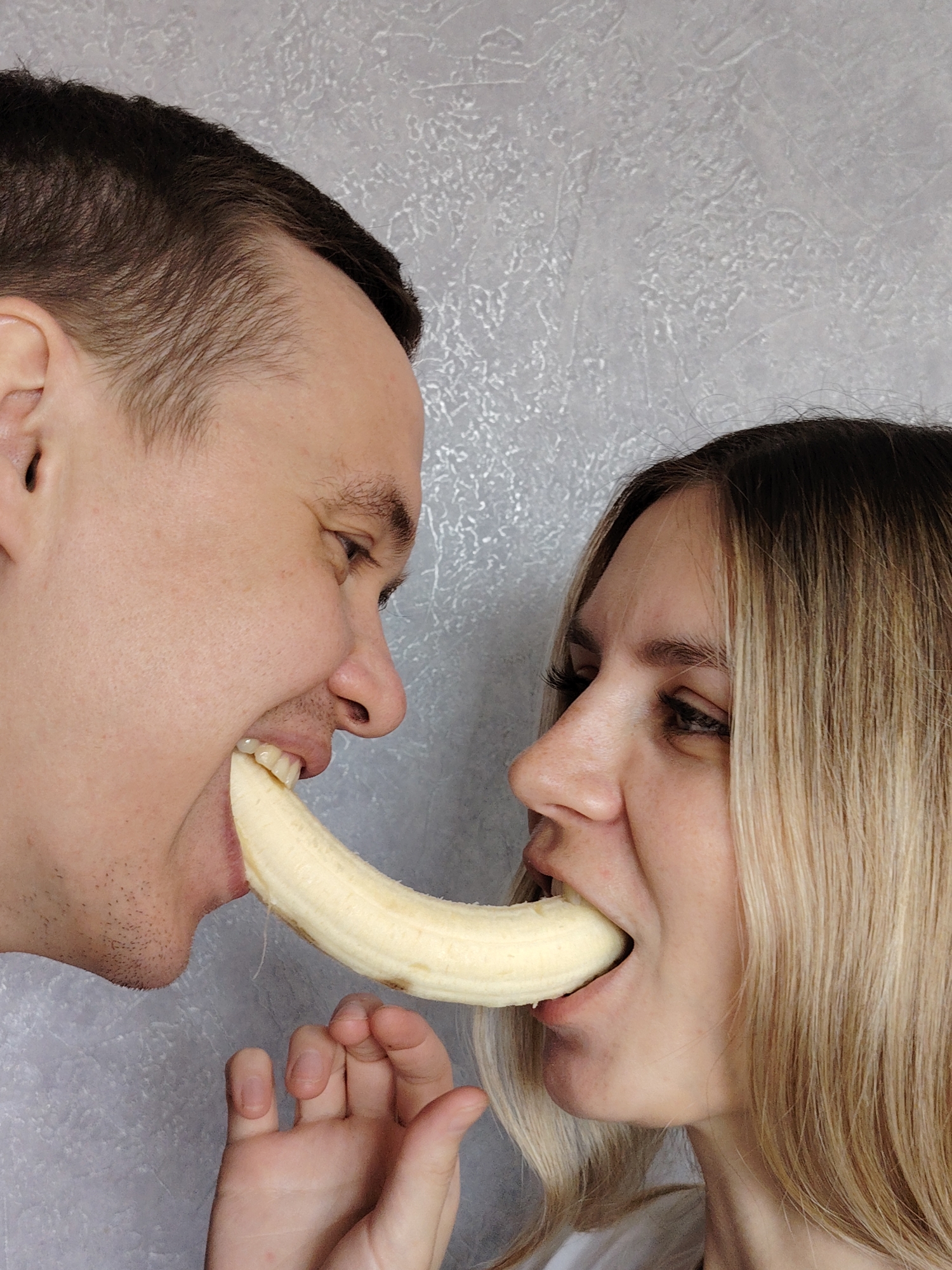 two individuals, a man and a woman, each with a portion of a peeled banana in their mouths, sharing the same banana. The man has dark hair and fair skin, while the woman has blonde hair and fair skin. They are positioned closely together, facing each other. A hand is visible near the man's side, possibly supporting the banana. The background appears to be a textured grey wall. No specific location in the city of Chaikovsky, Russia can be identified from the image.