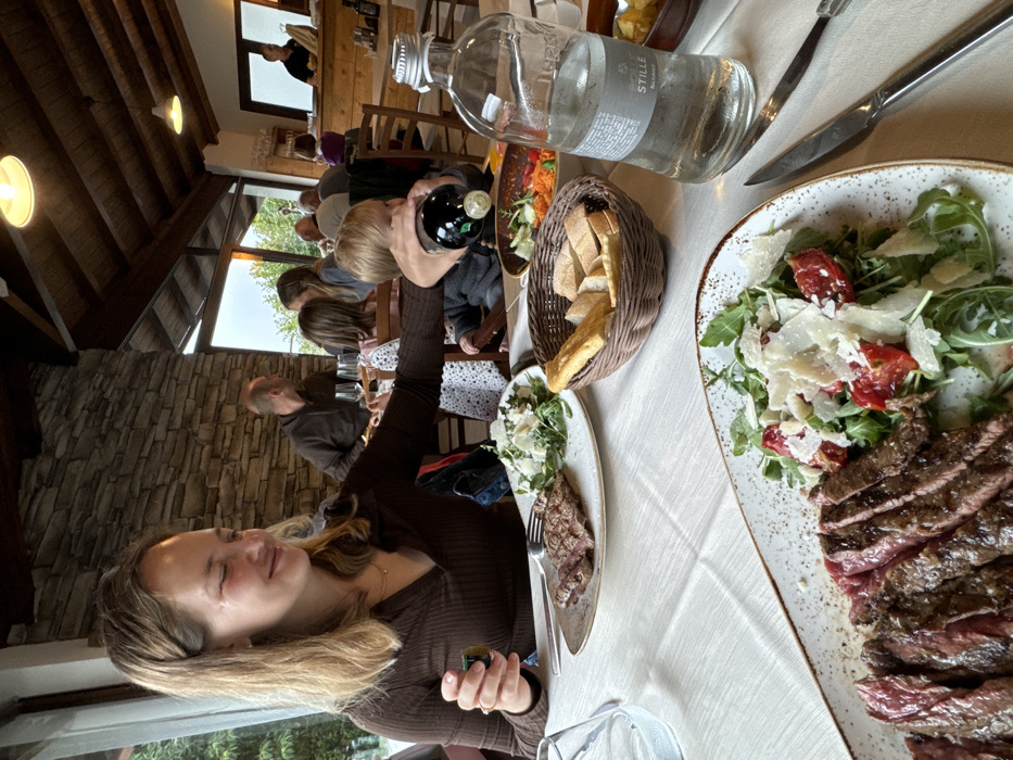 This image depicts an indoor restaurant scene in Bellagio, Italy. In the foreground, a female with light brown hair, wearing a brown ribbed long-sleeved top, smiles while holding a small, dark glass in her right hand. Her left arm is extended towards a young child seated in a high chair to her right. The child, with light hair, is holding a dark green wine bottle to their mouth with their left hand, while the female's left hand is positioned over the child's hand and the bottle. The table, covered with a white tablecloth, features two plates. The plate in the immediate foreground displays slices of medium-rare grilled steak alongside a salad of arugula, cherry tomatoes, and shaved Parmesan cheese. A second, similar plate is visible further back. A woven basket containing bread pieces, a clear glass carafe with water, and a clear glass bottle labeled "STILLE Naturale" (still water) are also on the table. Cutlery is present beside the plates. In the mid-ground and background, other patrons are seated in the restaurant. A bald adult male in a dark top is visible, looking towards the right, with several children and other adults seated near him. The interior features a stone-clad wall on the left and a wooden beamed ceiling with exposed wooden planking and pendant lights. Large windows on the right side of the background reveal an outdoor view with trees. A wooden bar counter with a male staff member standing behind it is visible in the far right background. The scene is illuminated by both the overhead pendant lighting and natural light entering through the windows.