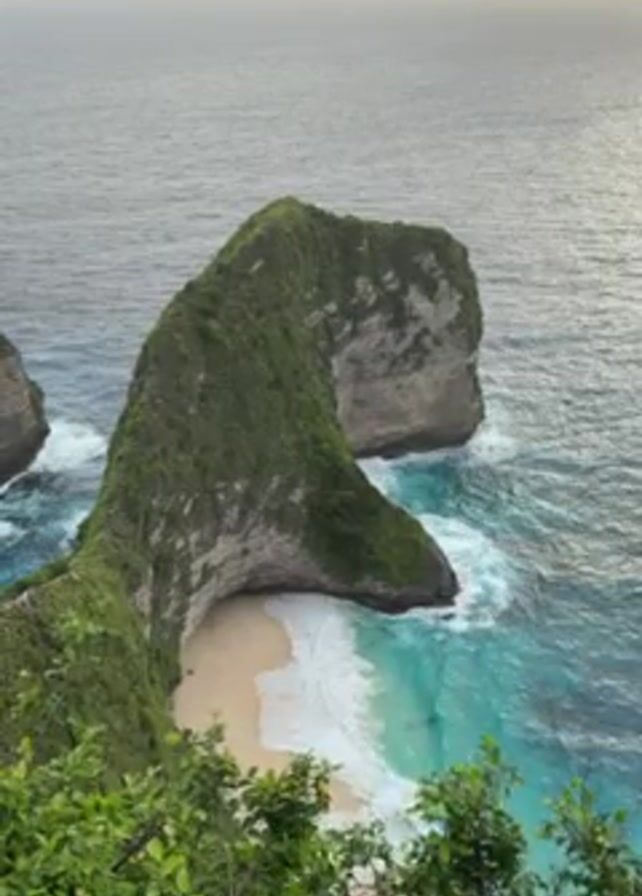 scenic view of a rocky, island outcrop from a high vantage point. The outcrop is covered with vegetation, primarily green, and extends into a blue ocean. A small sandy beach is nestled at the base of the outcrop, where the ocean waves meet the shore. There are a few small plants in the foreground, closer to the camera. The sky appears overcast with a light, neutral tone. There is indistinct background chatter.