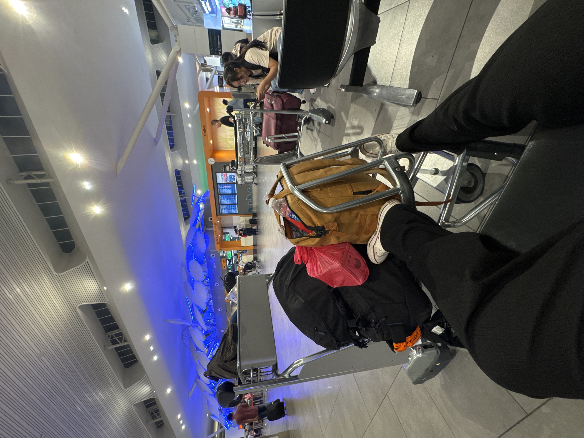 The image captures an indoor scene within an airport terminal, specifically Kuala Lumpur International Airport 2 (KLIA2) in Sepang, Malaysia, identifiable by its distinctive blue-lit, structured ceiling architecture. The viewpoint is from a seated individual, with their legs and feet in black trousers and white sneakers resting on a silver metal luggage trolley in the foreground. This trolley carries multiple items: a large black backpack, a red plastic bag with a faint smiley face, a tan backpack with a water bottle in its side pocket, and an olive green duffel bag. To the right, a young woman with dark hair, wearing a light-colored t-shirt and jeans, is seated on an airport bench, looking down at and operating a smartphone. Behind her, a maroon-colored rolling suitcase is positioned on another trolley. In the midground, an orange counter area labeled "Trolley" is visible, flanked by digital display boards showing text and data. Further to the right, a "Service Counter" sign is present. Various other individuals are distributed throughout the terminal background; one man in a red shirt is seen pushing a black rolling suitcase on the left. The floor is light grey tiled, and the high ceiling features white panels, recessed lighting, and bright spotlights, with a prominent blue-illuminated structural element in the upper center.