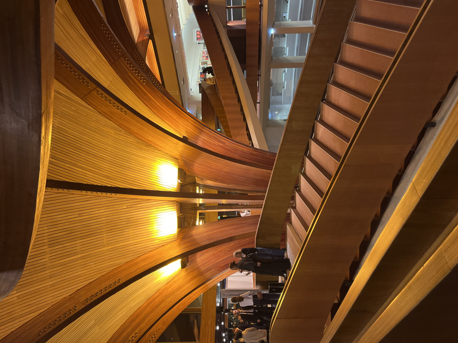 The image depicts the interior of the Théâtre National de Strasbourg (TNS), located in Strasbourg, France. The scene presents a multi-level architectural space dominated by warm-toned wooden structures. Overhead, a large, curving, fan-like ceiling or canopy, constructed from numerous parallel wooden planks and prominent support beams, spans the upper frame and is illuminated by warm, recessed yellow lights. Multiple flights of stairs with solid wooden balustrades and carpeted treads (appearing reddish-brown) descend through the midground and foreground from left to right. A group of approximately 6-8 adults is visible on a landing in the mid-left. One individual wears a long dark coat or dress. To their immediate left, other individuals are present, one holding a red wine glass. In the upper right background, two individuals are seated on a wooden balustrade of an upper-level staircase. Further background levels show indistinct figures and brighter, more open areas. The overall environment suggests a public indoor space, possibly during a social event or reception.