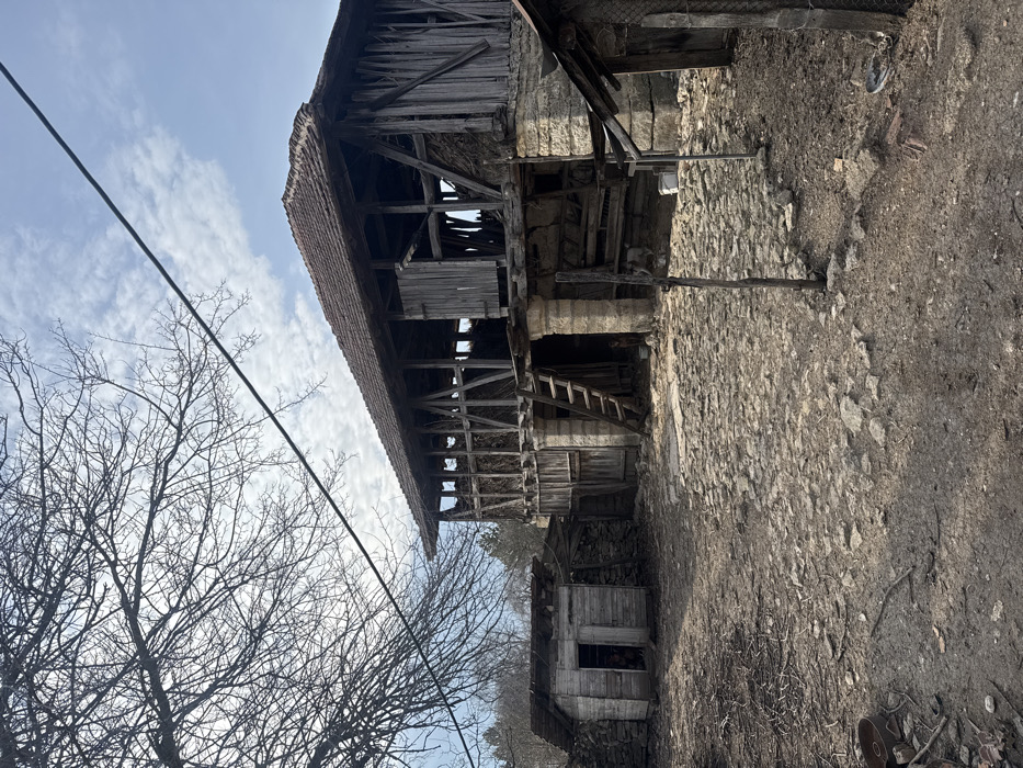 The scene depicts a rural setting in Rabrovo, Bulgaria, under a partly cloudy sky. The dominant feature is a two-story building, centrally located and extending to the right. Its lower level consists of sturdy, light-colored stone pillars and walls, creating a partially open ground floor. An unpainted wooden ladder, dark brown, leans against one of these stone pillars, providing access to the upper level. A small, dark-colored animal is visible in the shadows beneath the ladder. White plastic buckets are positioned near the base of the structure. The upper level is a timber-framed structure with weathered gray wooden beams and vertical slats, many of which are missing or damaged, revealing dried vegetation (likely hay or straw) stored within. A single, partially open wooden door is visible on this upper level. The building is topped by a gabled roof covered with reddish-brown terracotta tiles, some of which appear broken or dislodged. To the left of the main building, a smaller, single-story wooden shed stands. It features a dark, sloped roof and walls constructed from vertical wooden planks. Its doorway is open, revealing a dark interior. Piles of stone rubble are situated against the side and rear of this shed. The ground in the foreground is an uneven mix of light brown dirt, sparse dry vegetation, and scattered debris including small branches. A significant portion of the ground between and in front of the structures is paved with irregular, light-colored stones, forming a rough courtyard. In the far left foreground, an overturned rusted metal container and other metallic fragments lie on the dirt. Bare, dark tree branches, devoid of leaves, extend across the upper left quarter of the image, indicative of a dormant season. Further deciduous trees are visible in the background. A single dark utility wire traverses diagonally from the upper left towards the middle-right of the frame, passing above the main building. The sky is light blue with scattered white, wispy stratocumulus clouds. No people are present in the scene.