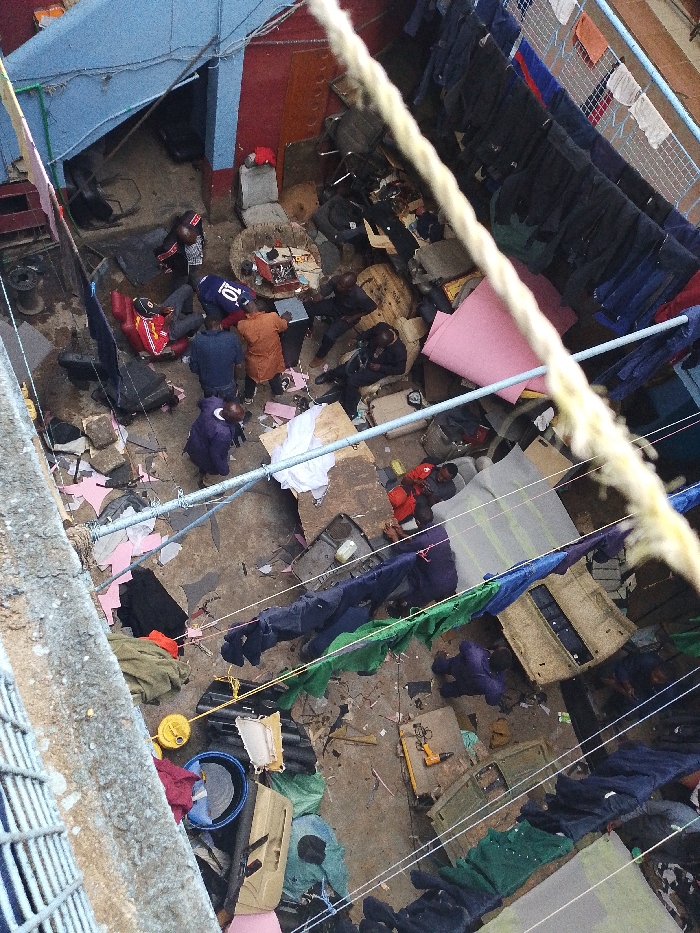 From a high angle, the outdoor scene reveals a cluttered courtyard