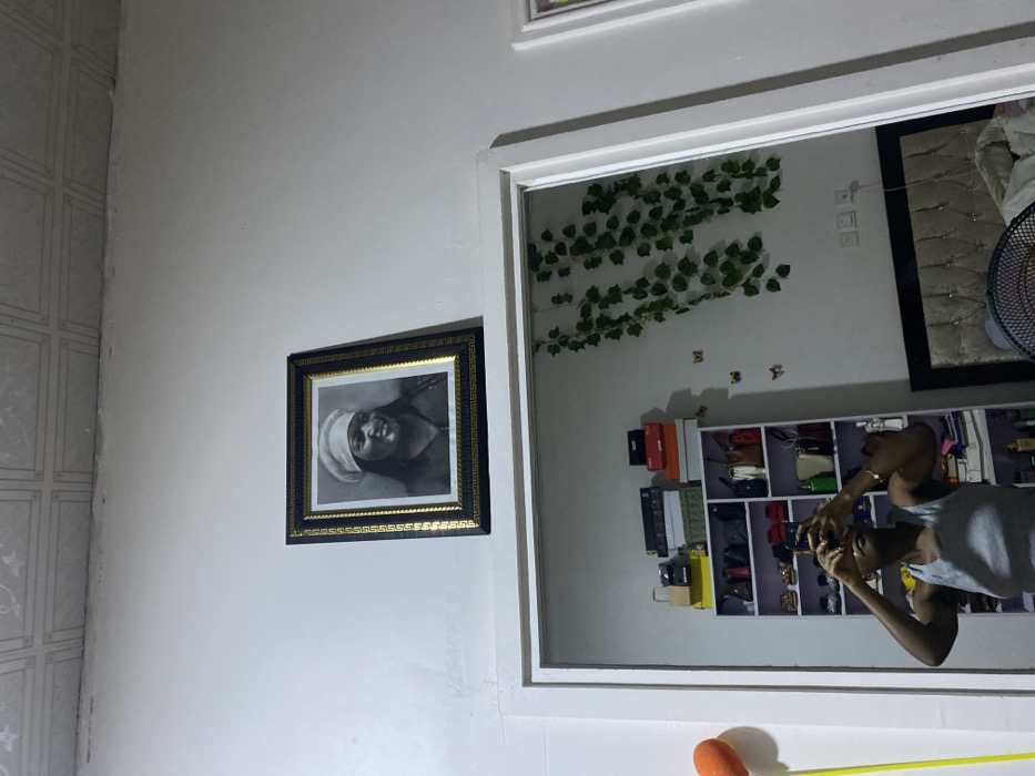 This image depicts an indoor domestic scene located in Sabon Tasha, Nigeria. The primary view is a mirror's reflection of an interior space, framed by a white casing. Above the mirror, a framed black and white portrait hangs centrally on a white wall. The portrait displays a smiling individual, wearing a light-colored headwrap. The frame is black with a gold Greek key pattern border. The ceiling above features white, patterned decorative tiles. Within the mirror's reflection, a person is visible from the chest up, wearing a grey tank top and a bracelet on the left wrist. This individual holds a black smartphone with both hands, positioned to capture their reflection. To the left of the reflected person, a white open shelving unit is visible. Its top surface supports multiple stacked shoeboxes and other rectangular containers, with brand names like "MICHAEL KORS" and "BALENCIAGA" partially legible. The lower shelves are occupied by various handbags and accessories. To the right of the shelving unit's reflection, artificial green ivy vines are vertically arranged on the wall, with several small, brown butterfly decals affixed nearby. In the lower right quadrant of the mirror's reflection, a segment of a bed, featuring a light-colored, tufted, padded headboard, is visible. A dark-colored, floor-standing fan is positioned in front of the bed. Three square electrical outlets or light switches are affixed to the wall above the headboard.
