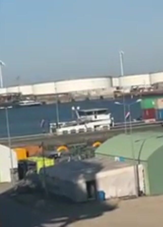 harbor scene under a clear blue sky. In the foreground, there are several arched buildings painted in white and green, along with yellow and orange shipping containers. A small, dark-colored car drives along the road near the water's edge. Moored at the dock is a white boat with a flat top. A flag, striped red, white, and black, is flying from a pole near the boat. In the background, there are large white storage tanks, shipping containers, cranes, and wind turbines. The water in the harbor is calm.