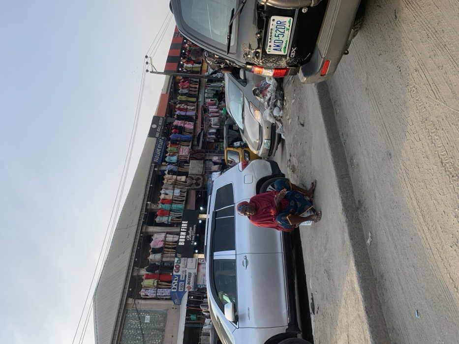 A street scene features a woman crouched beside a silver SUV. Her traditional attire consists of a red top and patterned blue skirt. Several vehicles are positioned nearby, including a black SUV with a Lagos license plate (AKD-52DR). Adjacent to the road is a building, its facade filled with numerous shops and signs like "FAB LANE BY ADY" and "BURN FIRE Boutique." Advertisements for DStv and Access Bank are also visible, painting a lively urban tableau.