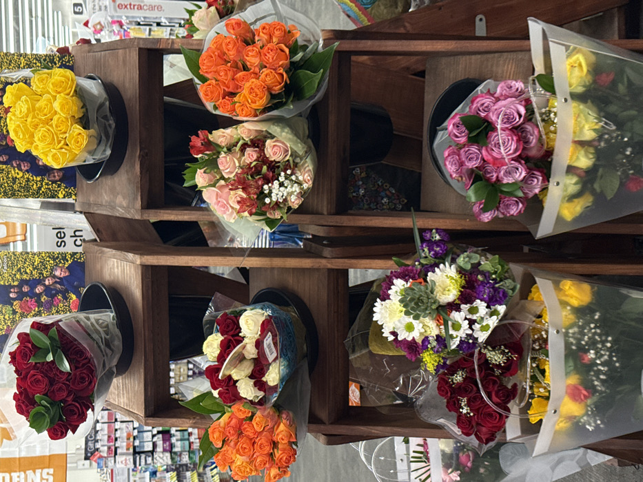 A tiered wooden display shelf holds a variety of colorful bouquets