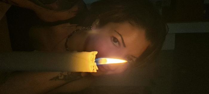The scene depicts a dimly lit indoor environment in Nahariyya, Israel. A female subject is positioned behind a burning, light-colored pillar candle, which acts as the primary light source. The candle flame partially obscures the subject's face, with her right eye (viewer's left) clearly visible and directed forward. She has dark hair and wears a dark top, a dark-beaded necklace, and a chain-link earring on her left ear (viewer's right). A dark tattoo is visible on her left upper arm/shoulder (viewer's right), with additional markings on her right arm (viewer's left). The background is dark and indistinct due to low illumination.