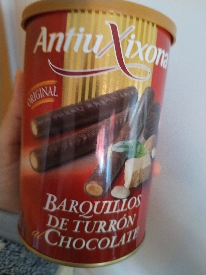 A cylindrical food product container, branded "Antiuxixona ORIGINAL," is held upright by a human hand on its left side. The container's label features a golden upper section with vertical stripes and a red lower section. "Antiuxixona" is prominently displayed in gold script with a red outline. Below, "ORIGINAL" appears in white text within an orange-brown oval. The label depicts several chocolate-covered wafer rolls (Barquillos) with a lighter-colored filling visible at their ends. Accompanying the Barquillos are pieces of turrón, whole almonds, and a green leaf. The product description "BARQUILLOS DE TURRÓN al CHOCOLATE" is written in white text on the red section of the label. The container has a golden lid. The background is a plain, out-of-focus, light-colored surface. The scene takes place in Sucina, Spain.