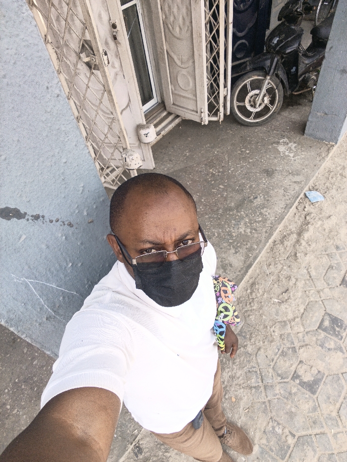 - "A dark-skinned male, appearing middle-aged with a shaved head, is depicted in a high-angle selfie photograph taken outdoors in what is identified as an urban street or doorway area in Dakata, Nigeria" by FM-Bh3W72, licensed under CC BY 4.0