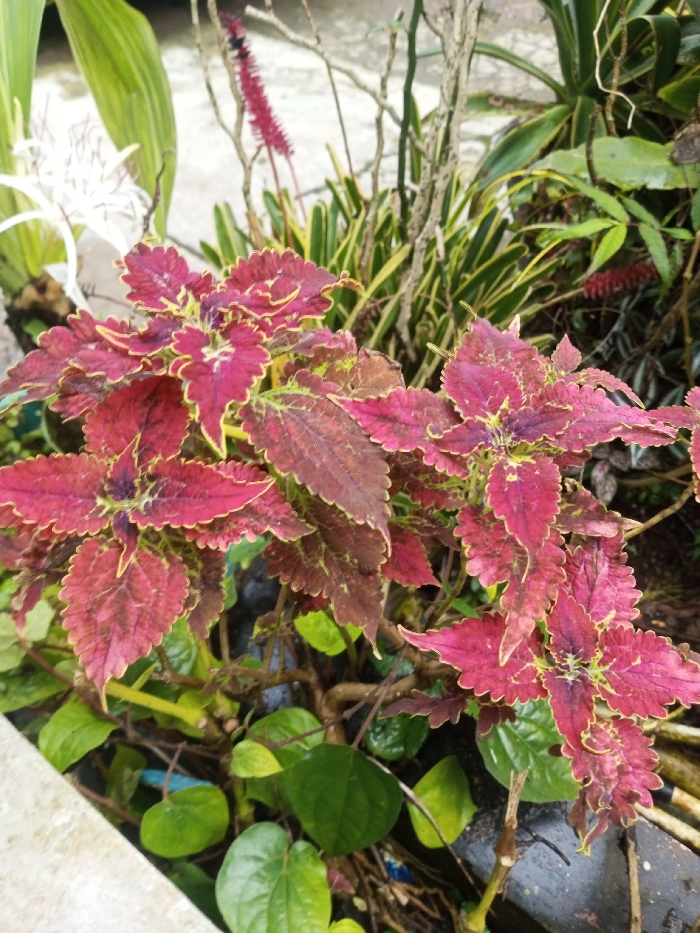 This image depicts a detailed close-up of a vibrant botanical arrangement, likely situated within a garden or planter in the city of Pandaria, India. The foreground and central focus is a cluster of Coleus plants (Plectranthus scutellarioides), characterized by their deeply serrated leaves exhibiting a dominant coloration of dark reddish-purple with prominent lime-green to yellow-green margins and veining. Each leaf displays a complex, irregular pattern of these colors. Below and to the left of the Coleus, smaller, solid green, heart-shaped leaves are visible, indicating groundcover foliage. In the mid-ground and background, additional plant species are discernible. These include tall, thin, gnarled branches, strappy green leaves, some variegated with yellow stripes, and a slender, bright red, spiky inflorescence. Partially visible in the upper left background is a large white flower with delicate, spider-like petals. A light-colored, possibly concrete or stone, border or planter edge is present along the lower left quadrant of the frame. The growing medium appears dark and moist, and the scene is illuminated by diffuse daylight, casting no distinct shadows. No people, animals, or human artifacts beyond the implied garden infrastructure are present, and no actions or interactions are depicted.
