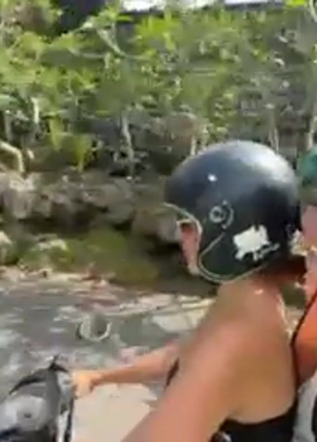 Two young women are riding a moped on a paved road. The woman driving is wearing a black helmet and sunglasses and a black bikini top. The passenger is wearing a green helmet and a brown bikini top and is holding the camera to record the scene. They are both smiling. The moped is moving forward and slightly downhill. Lush green vegetation lines both sides of the road, creating a tunnel effect. The sky is visible through the trees.