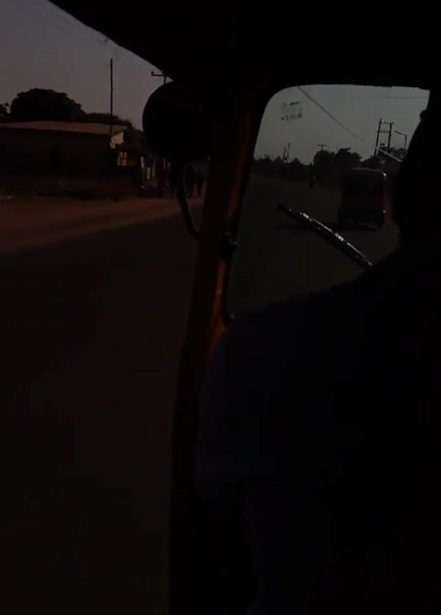 ride in a yellow auto rickshaw, moving along a paved road during daylight. The camera is positioned inside the rickshaw, capturing the view through the passenger side. A person in a light-colored shirt is visible in the foreground. Outside the rickshaw, a small group of people is walking on the side of the road. Other vehicles can be seen in the distance, including another auto rickshaw. The sky is clear, and the overall environment appears to be a residential area.