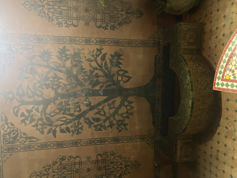 An overhead shot reveals a tiled floor with intricate designs