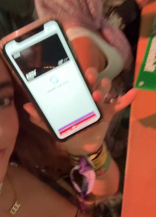 A woman stands in a crowded space, holding a phone displaying an app or website that is loading. The camera pans to show a table cluttered with various items including boxes, decorations, and what appears to be snacks. The camera returns to show the phone, then pans again to show an iPad. It is loading a similar screen. The camera moves back to the woman's face, which is blurry and indistinct due to the poor lighting and motion. The lighting in the room appears to be a mix of red and blue.