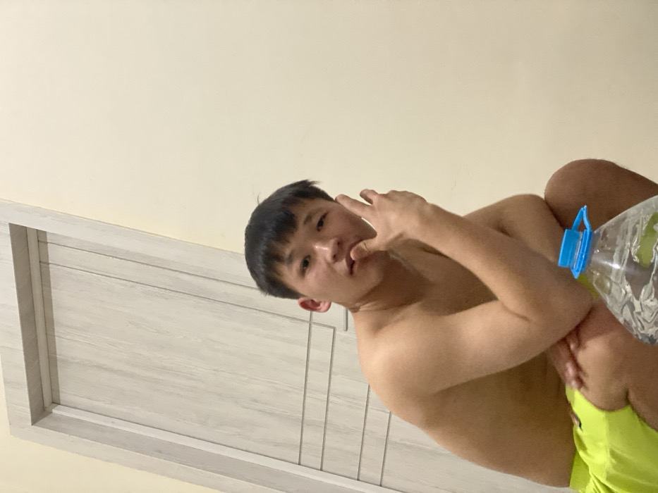 A shirtless Asian man poses with a water bottle. He's angled towards the camera, wearing light green shorts. His right hand is near his face, fingers slightly spread. Behind him is a white or light grey door with vertical lines and a plain white wall above it. The plastic water bottle has a blue lid and is partially obscured by his arm. The lighting is bright and somewhat diffused.